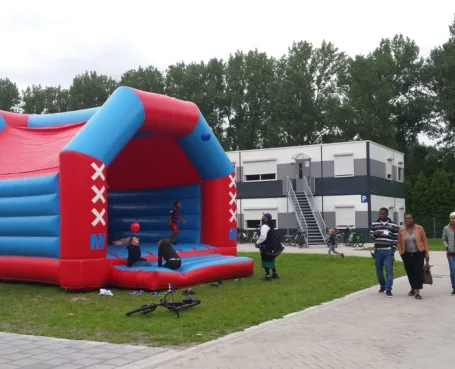Buiten naast het centrale gebouw staat een springkussen waar Nederlandse en buitenlandse kinderen zich uitgelaten samen vermaken. Een groep meisjes springt touwtje, terwijl Nederlandse ouders druk in gesprek zijn met bewoners van het asielzoekerscentrum. Als je niet beter zou weten, zou het ook een gezellige burendag kunnen zijn. Een blik naar links bewijst echter het tegendeel. Daar staan de tijdelijke woningen van asielzoekers. Groen-witte blokken keurig opgesteld in een vierkant. Bij sommige blokken staat de voordeur open en zitten bewoners op de trap. Andere woningen zien er verlaten uit. In het midden is het washok met een aantal wasmachines, een beetje zoals op een camping. Dit is de realiteit en het leven van nieuwkomers in Nederland. Soms hebben mensen geen idee wat het leven in een asielzoekerscentrum inhoudt. Nu heeft iedereen de kans om een kijkje te nemen achter de schermen. Soms schrikken mensen, anderen zijn blij verrast dat het allemaal goed geregeld is.