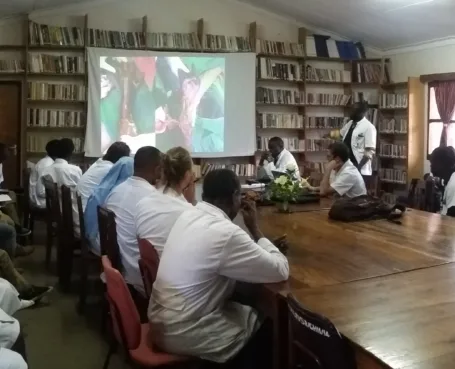 Tijdens het ontbijt bespreken we het OK-schema en eten een wit bolletje pindakaas of pap voor de liefhebber. Om 7.30 uur start de ‘doktersmeeting’ aan een hele lange tafel in de bibliotheek, waar alle artsen binnendruppelen, terwijl de overdracht van de nacht plaatsvindt. Aan het hoofd van de tafel zit Dr. Nuwass, het hoofd van het ziekenhuis, en twee afdelingshoofden. Ik vind het moeilijk om de gesprekken goed te volgen, het is even inkomen in het Tanzaniaans Engels en de snelheid waarmee ze praten.