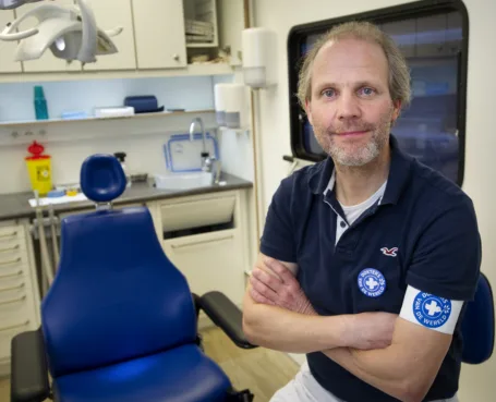 Tandarts Xander Meijs was voor het eerst de vrijwillige tandarts van dienst op de Mondzorgkaravaan van Dokters van de Wereld (NL): ‘Er zijn veel mensen die maar net het hoofd boven water kunnen houden. Zij kunnen mondzorg gewoon niet betalen met alle gevolgen van dien. Toen ik de petitie zag om mondzorg terug in basispakket te krijgen, heb ik die meteen getekend. Ook deed ik een donatie en bood ik mijn diensten aan. En nu ben ik hier.’