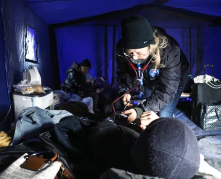 Ons team van artsen, een verloskundige, een verpleegkundige, een kinderarts en sociaal werker verlenen medische zorg in ons mobiel kabinet in Sirit, een Roemeense stad vlakbij de grens met Oekraïne. De meeste mensen die momenteel aankomen in de buurlanden zijn vrouwen en kinderen. De mannen die kunnen vechten, zijn achtergebleven in Oekraïne. Daarom hebben we ons team versterkt met een vroedvrouw en een kinderarts.