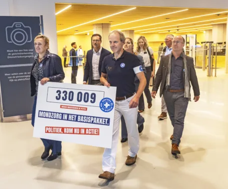 Na ruim 2 jaar actievoeren overhandigen we de petitie ‘Mondzorg terug in het basispakket’ aan de Tweede Kamer. Samen met meer dan 330.000 Nederlanders vragen we het kabinet in actie te komen voor de anderhalf miljoen mensen in Nederland die de tandarts niet meer kunnen betalen.