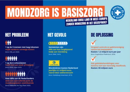 Niemand mag door geldgebrek rondlopen met pijn, ontstekingen of schaamte. Namens meer dan 1,5 miljoen Nederlanders roepen wij het kabinet op: maak de tandarts weer voor iedereen toegankelijk, net als in andere Europese landen.